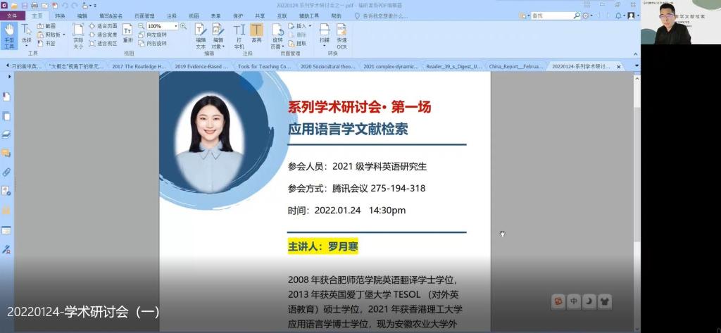 本网讯 为了不断提升古天乐代言太阳集团研究生培养质量,加强对研究生培养的过程性监督与督促,2022年1月24日下午2点30,在古天乐代言太阳集团研究生部的组织下,为2021级学科教学(英语)方向的研究生举行了一场线上学术研讨会,所有2021级研究生同学及部分2018级本科同学参与了本次线上研讨会。本次学术研讨会邀请了安徽农业大学古天乐代言太阳集团罗月寒博士作为主旨发言人,发言话题为“应用语言学文献检索”,外院研究生部主任蒋道华、研究生导师强云,吴礼敬参与了本次线上研讨。