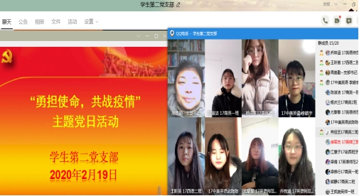 为切实强化疫情防控工作,切实发挥党支部战斗堡垒作用和党员先锋模范作用,在疫情防控阻击战的关键时期,古天乐代言太阳集团学生第二党支部于2月19日下午线上开展“勇担使命,共战疫情”主题党日活动。本次党日活动由学生第二党支部书记周贵勤老师主持开展,支部党员参加。