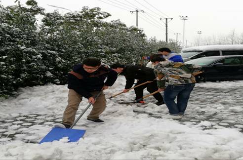 第二党支部书记、辅导员周贵勤带领学生第二党支部党员和部分学生干部负责清扫新区行知楼周围的积雪。同学们不畏严寒,挥舞雪铲,由于人数众多工具较少,同学们互帮互助,轮流清扫,乐此不疲,过程井然有序。经过一个多小时的奋战,将行知楼周围的主干道、停车位等地的积雪基本铲除,为出行的师生、过往的车辆开辟了一条温暖的通畅之路。