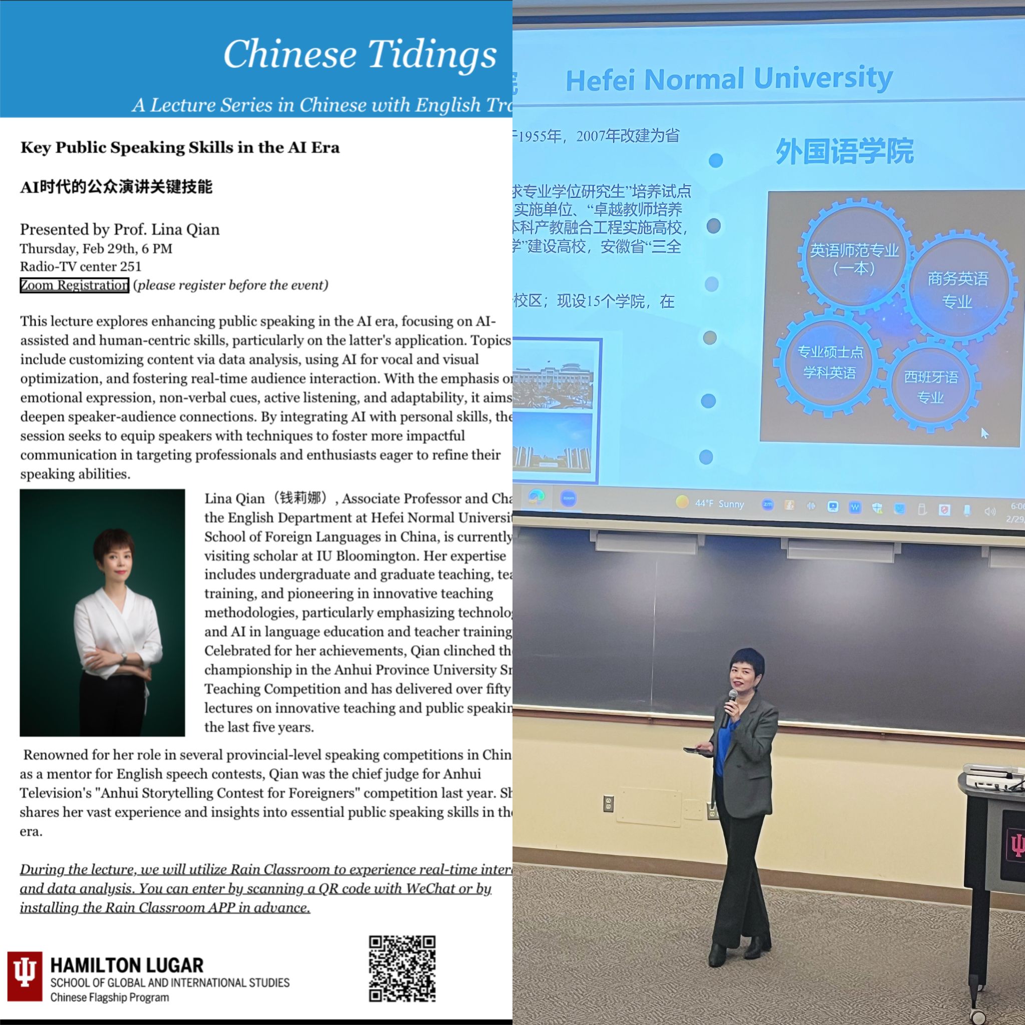 3月初,受美国印第安纳大学中文领航项目的邀请,古天乐代言太阳集团副教授、英语系主任钱莉娜老师开展了一场题为“AI时代的公众演讲关键技能”讲座,印第安纳大学中文领航项目师生、其他学院的部分师生到现场参加讲座,同步进行网络直播,部分师生在线上参加了本次讲座。钱莉娜副教授在美国印第安纳大学的两位访学导师也到现场参加了本次讲座,他们分别是印第安纳大学教育学院Cur Bonk教授和语言技术中心主任寇晓静博士。