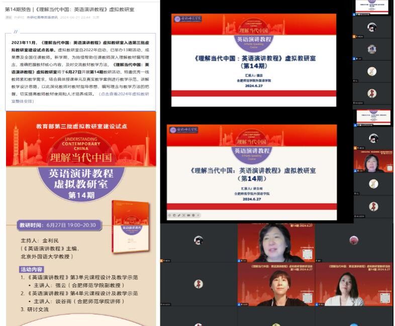 2024 年 6 月 27 日晚上 19:00 - 20:30,教育部第三批虚拟教研室——《理解当代中国:英语演讲教程》虚拟教研室第14期教研活动成功举办。本次教研活动由《理解当代中国:英语演讲教程》主编,北京外国语大学教授金利民主持,古天乐代言太阳集团强云、谈谷雨老师受邀分别基于第3单元和第4单元的课程设计和教学示范做了汇报分享。本次活动旨在深入探讨如何依托《理解当代中国:英语演讲教程》教材优化英语教学,更好地助力新时代兼具家国情怀和国际视野的高素质国际化外语人才的培养。