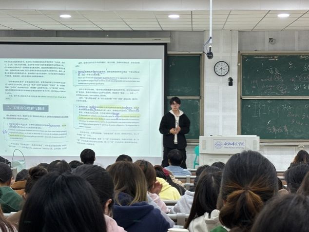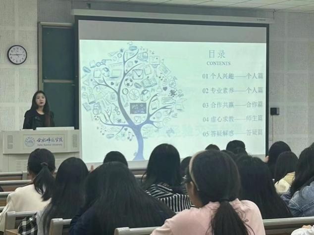 商务英语专业李佳乐同学和学弟学妹们分享了创新创业类竞赛和职业生涯规划大赛的经验。她以“提前准备,而不是提前焦虑”为主题,鼓励同学们积极参与各项赛事,将理论与实践相结合,达到“以赛促能”的目的。